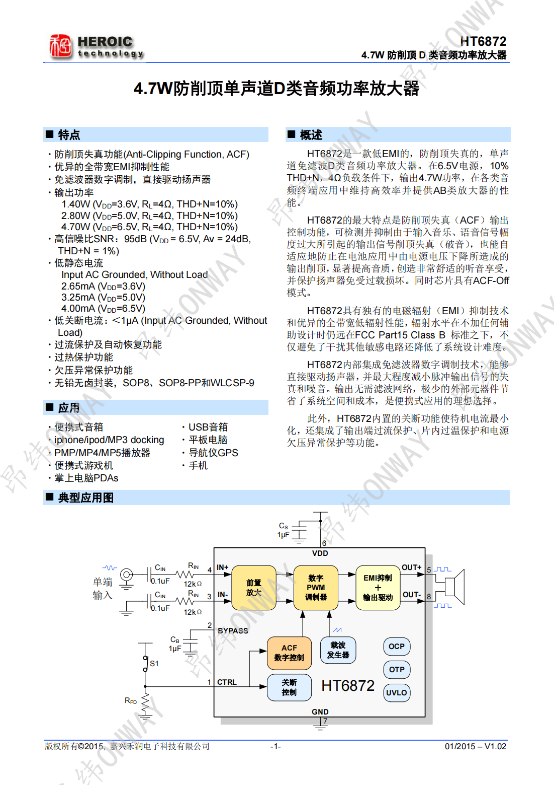 HT6872是一款低EMI的,防削頂失真的,單聲道免濾波D類音頻功率放大器。在6.5V電源,10%THD+N,4Ω負(fù)載條件下,輸出4.7W功率,在各類音頻終端應(yīng)用中維持高效率并提供AB類放大器的性能。