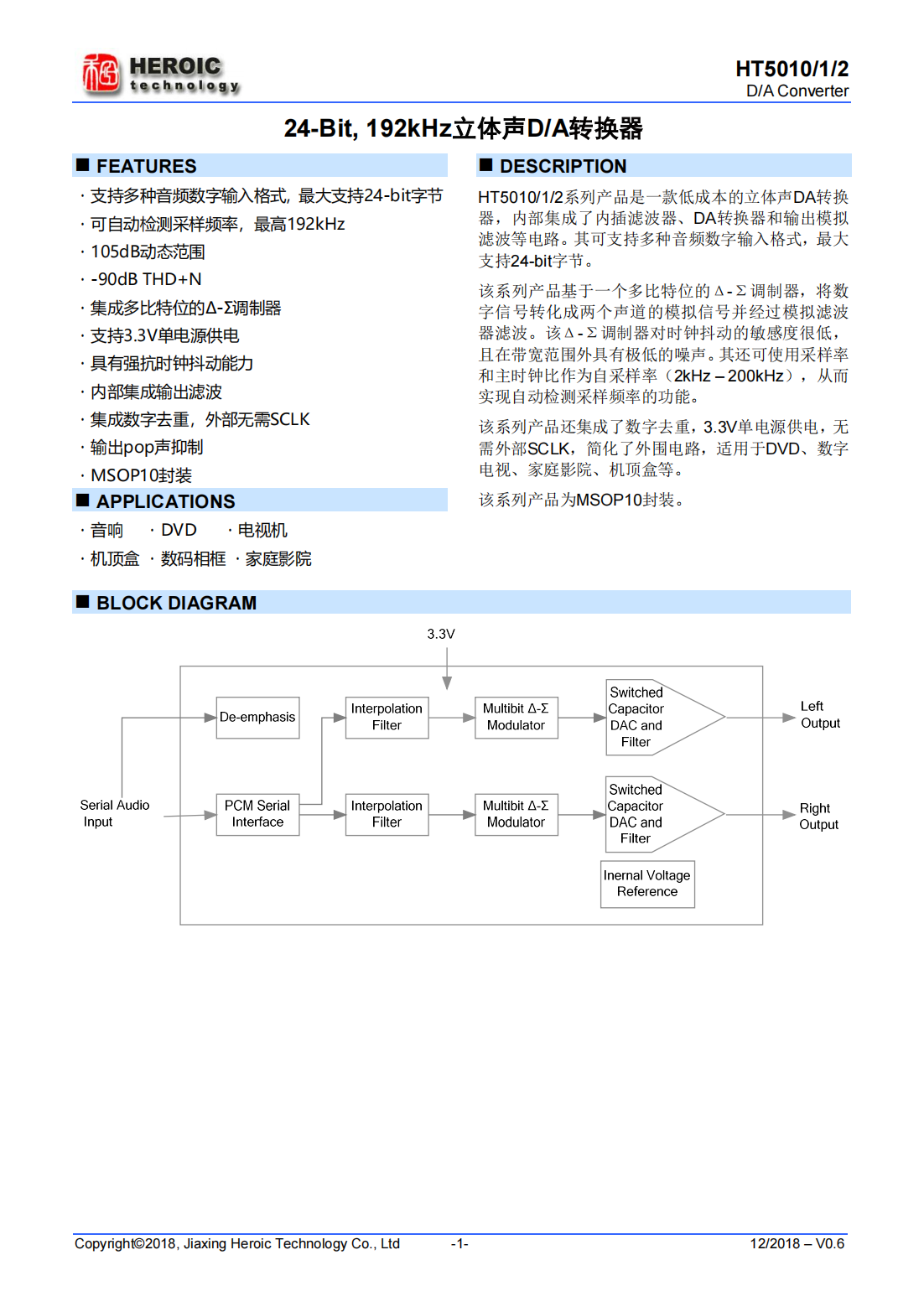 HT5010_192kHz立體聲D/A轉(zhuǎn)換器-禾潤(rùn)代理商