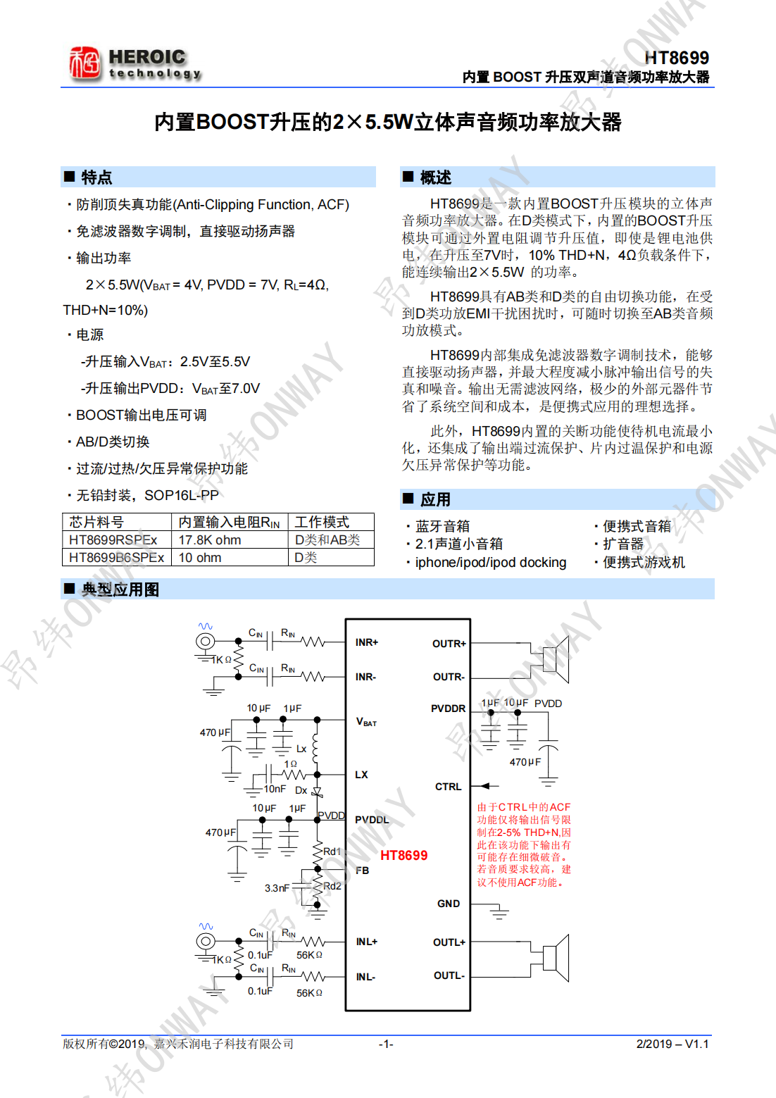HT8699內(nèi)部集成免濾波器數(shù)字調(diào)制技術(shù),能夠直接驅(qū)動(dòng)揚(yáng)聲器,并最大程度減小脈沖輸出信號(hào)的失真和噪音。輸出無(wú)需濾波網(wǎng)絡(luò),極少的外部元器件節(jié)省了系統(tǒng)空間和成本,是便攜式應(yīng)用的理想選擇。