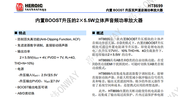 HT8699是一款內(nèi)置BOOST升壓模塊的立體聲音頻功率放大器。在D類模式下,內(nèi)置的BOOST升壓模塊可通過(guò)外置電阻調(diào)節(jié)升壓值,即使是鋰電池供電,在升壓至7V時(shí),10%THD+N,4Ω負(fù)載條件下,能連續(xù)輸出2×5.5W的功率。