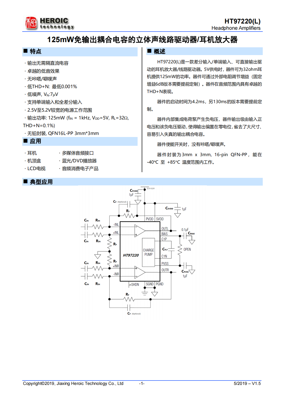 HT97220(L)是一款差分輸入/單端輸入、可直接輸出驅(qū)動的耳機放大器/線路驅(qū)動器。5V供電時,器件可為32ohm耳機提供125mW的功率。器件可通過外部電阻調(diào)節(jié)增益(固定增益6dB版本需要提前定制)。器件在音頻范圍內(nèi)具有卓越的THD+N表現(xiàn)。器件的啟動時間為4.2ms,另130ms的版本需要提前定制。器件內(nèi)部集成電荷泵產(chǎn)生負(fù)電壓,器件輸出級由輸入正電壓和該負(fù)電壓驅(qū)動,使得輸出偏置在零電位,省去了大尺寸、容易引入失真的輸出耦合電容。器件使能開關(guān)時,沒有咔嗒/噼噗聲。