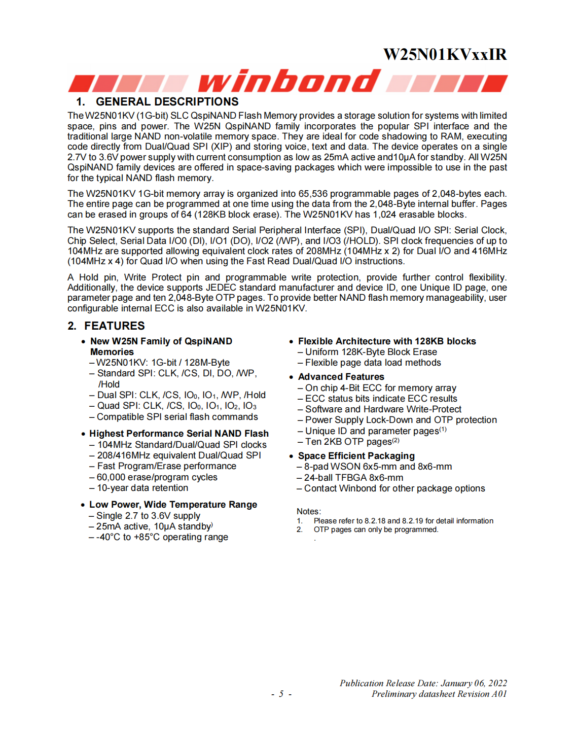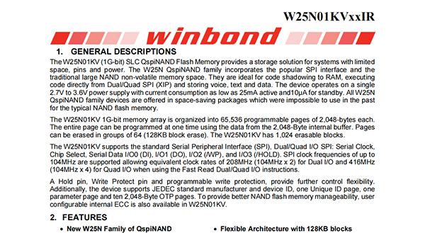 The W25N01KV (1G-bit) SLC QspiNAND Flash Memory provides a storage solution for systems with limited space, pins and power. The W25N QspiNAND family incorporates the popular SPI interface and the traditional large NAND non-volatile memory space