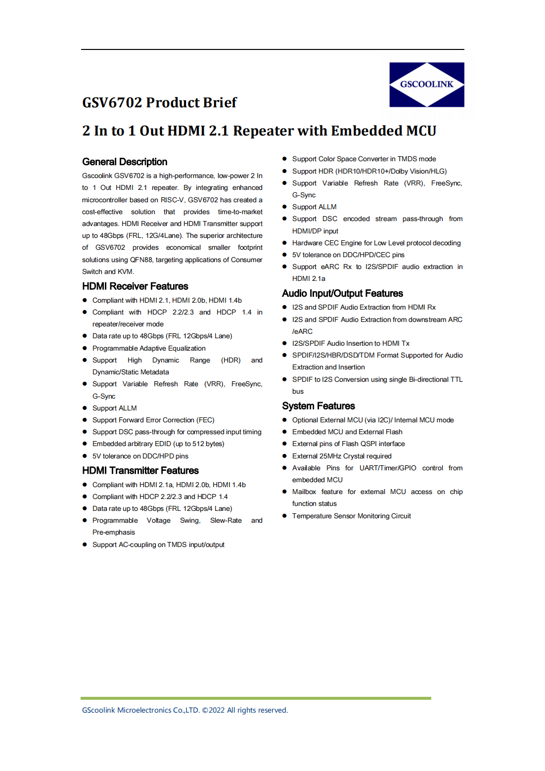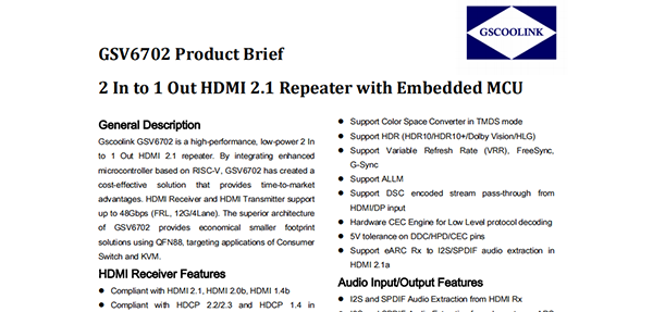 GSV6702_2 In to 1 Out HDMI 2.1切換器及矩陣芯片