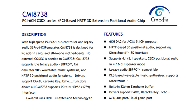 With high speed PCI V2.1 bus controller and legacy audio SBPro? DSPemulator,CMI8738 is designed for PC add-in cards and all-in-one motherboards