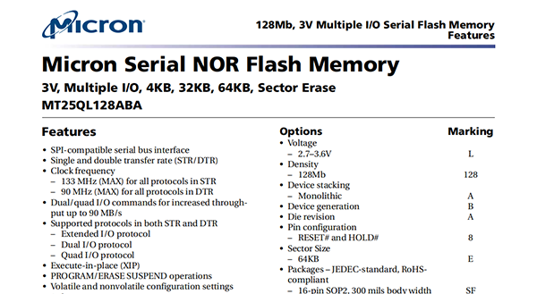 Micron Serial NOR Flash Memory 3V, Multiple I/O, 4KB, 32KB, 64KB, Sector Erase MT25QL128ABA