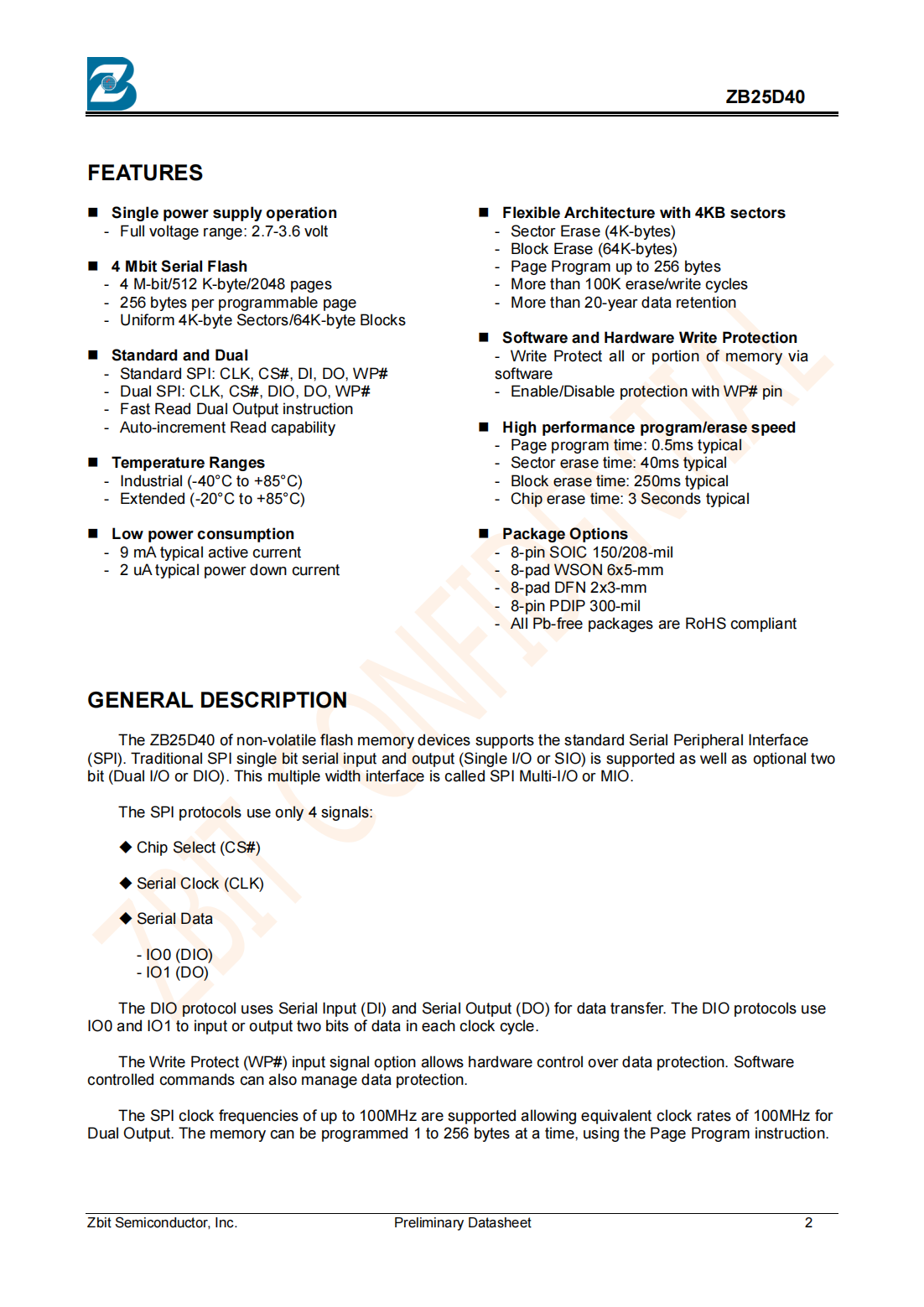?The ZB25D40 is designed to allow either single Sector/Block at a time or full chip erase operation.The ZB25D40 can be configured to protect part of the memory as the software protected mode.The device can sustain a minimum of 100K program/erase cycles on each sector or block.