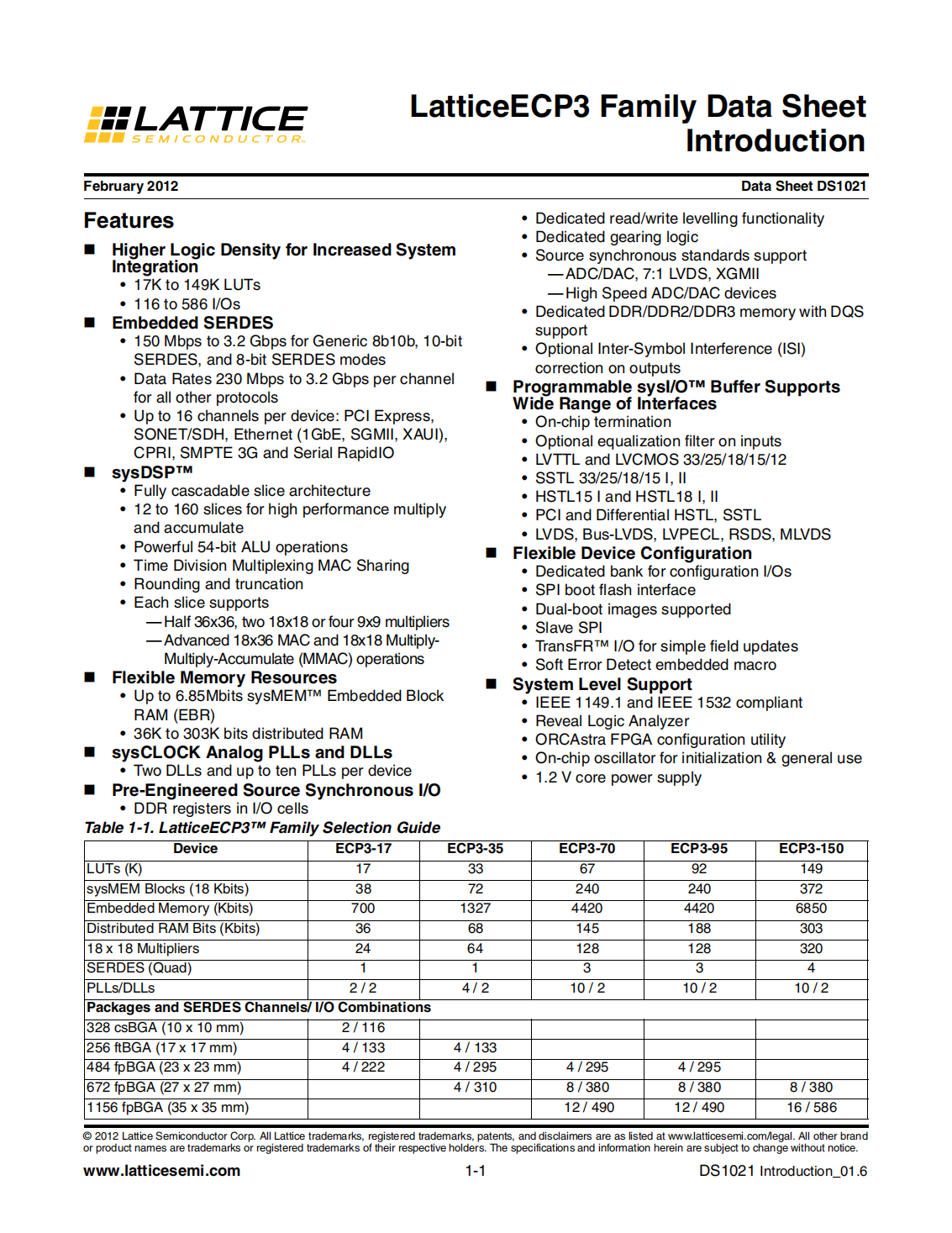 The LatticeECP3? (EConomy Plus Third generation) family of FPGA devices is optimized to deliver high performance features such as an enhanced DSP architecture, high speed SERDES and high speed source synchronous interfaces in an economical FPGA fabric