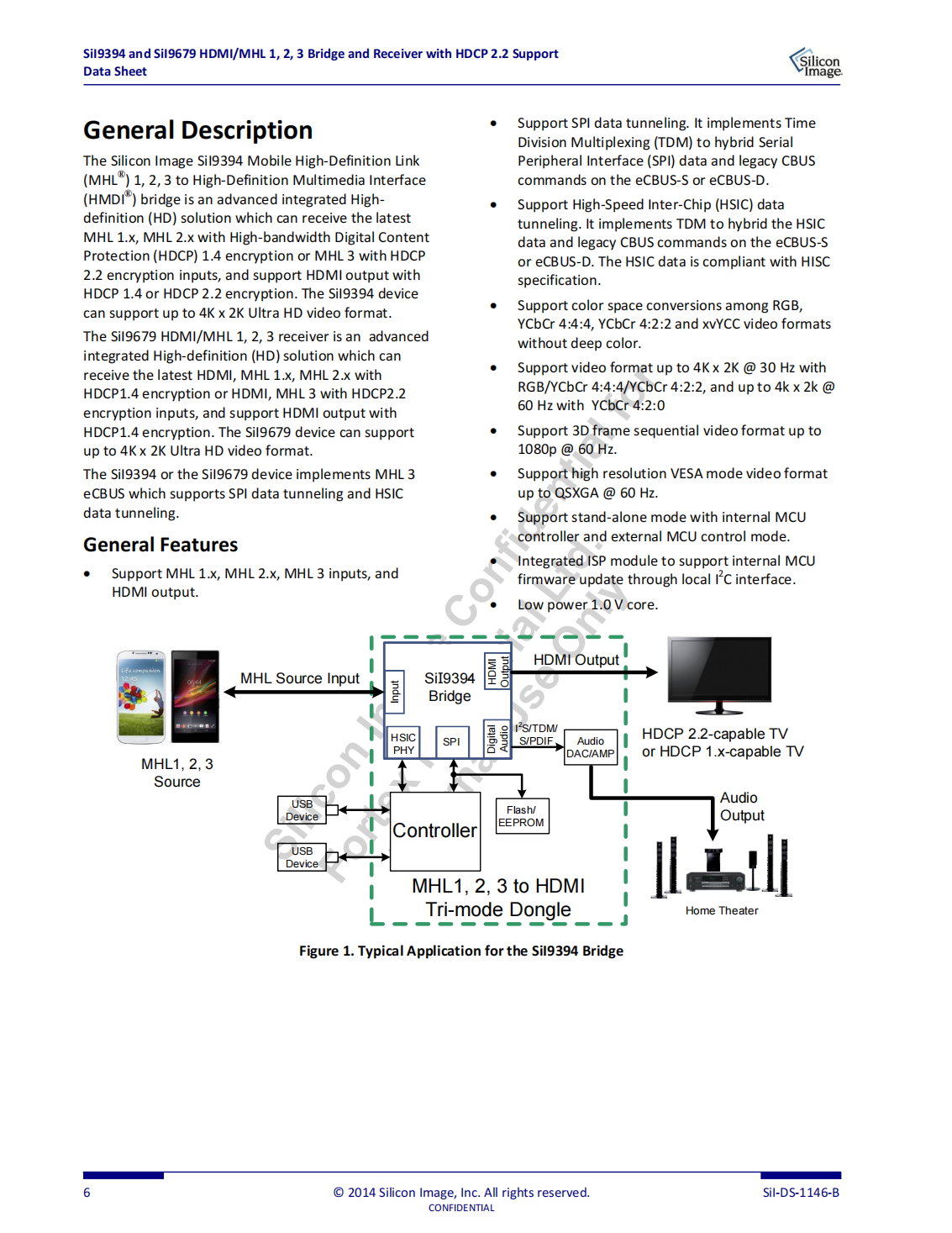 The Silicon Image SiI9394 Mobile High-Definition Link(MHL®)1,2,3 to High-Definition Multimedia Interface(HMDI®)bridge is an advanced integrated Highdefinition(HD)solution which can receive the latest MHL 1.x,MHL 2.x with High-bandwidth Digital Content Protection(HDCP)1.4 encryption or MHL 3 with HDCP2.2 encryption inputs,and support HDMI output with HDCP 1.4 or HDCP 2.2 encryption.The SiI9394 device can support up to 4K x 2K Ultra HD video format.