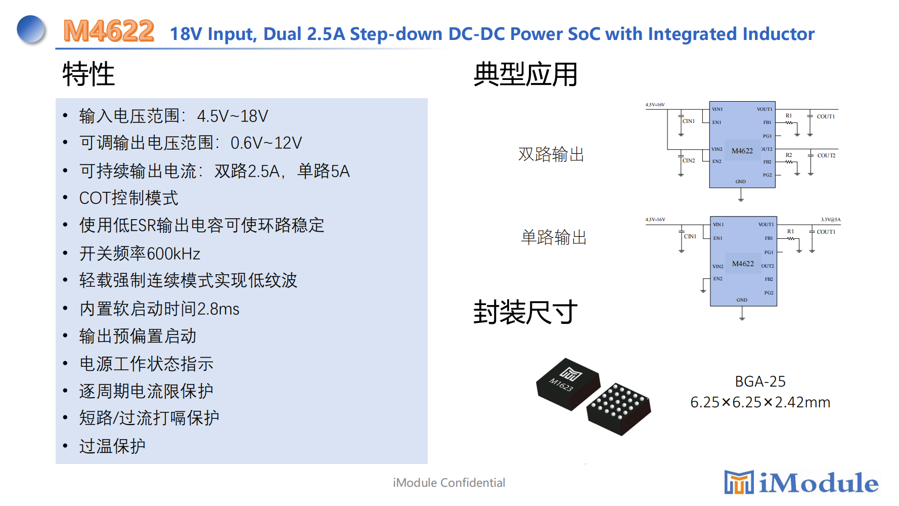 The M4622 is a dual 2.5A step-down switching mode Power SoC(System on Chip)with integrated power MosFETs,inductor and input decoupling capacitor in BGA-25 package.The input voltage is from 4.5V to 18V.