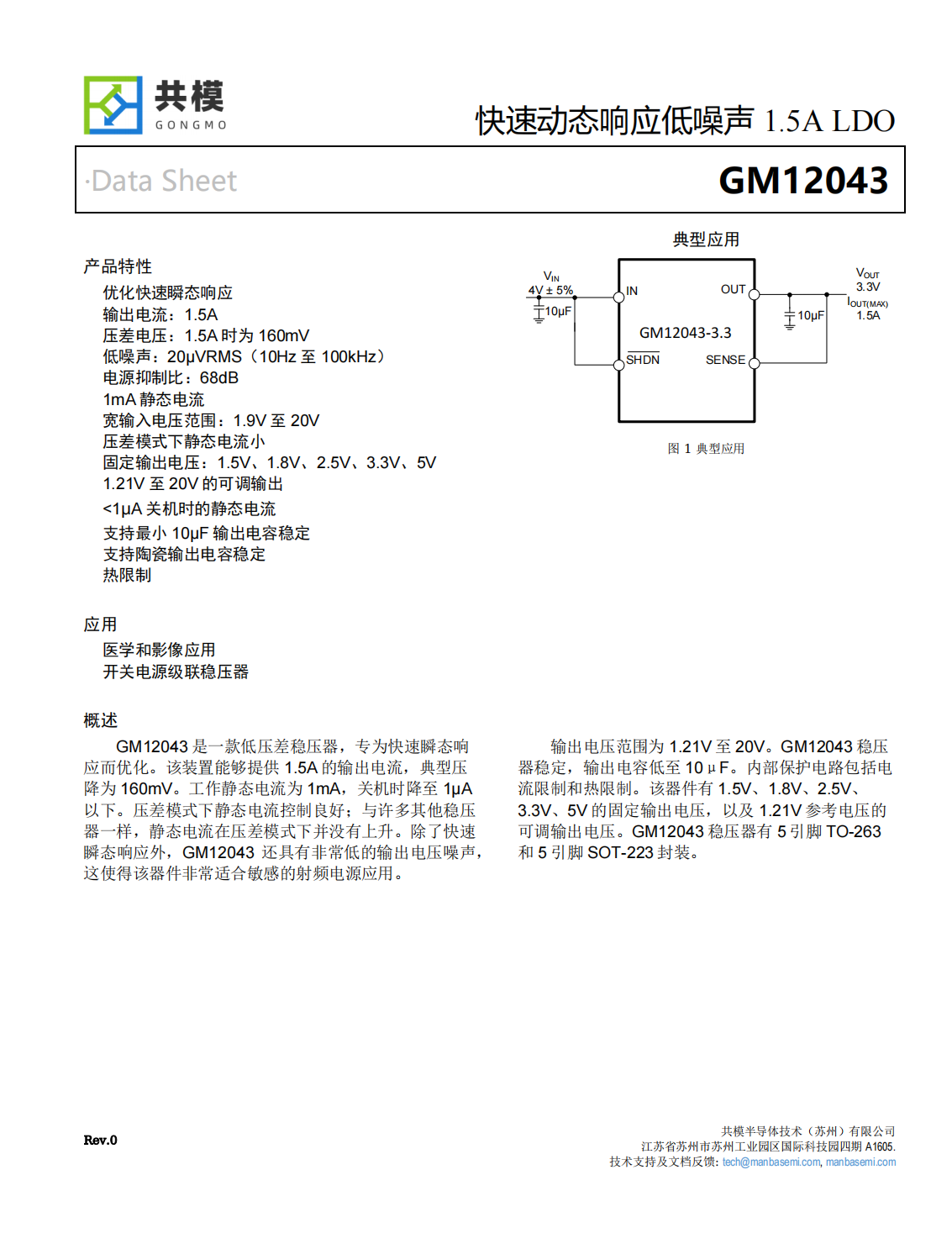 GM12043 是一款低壓差穩(wěn)壓器,專為快速瞬態(tài)響 應(yīng)而優(yōu)化。該裝置能夠提供 1.5A 的輸出電流,典型壓 降為 160mV