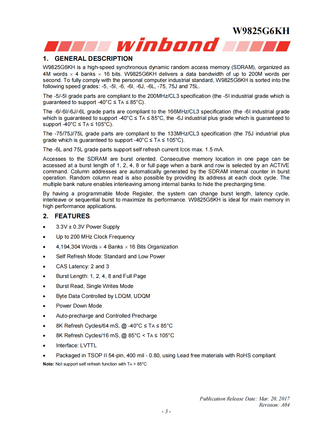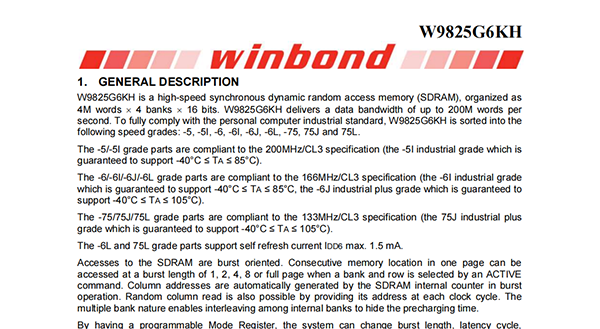 W9825G6KH is a high-speed synchronous dynamic random access memory (SDRAM), organized as 4M words ? 4 banks ? 16 bits.