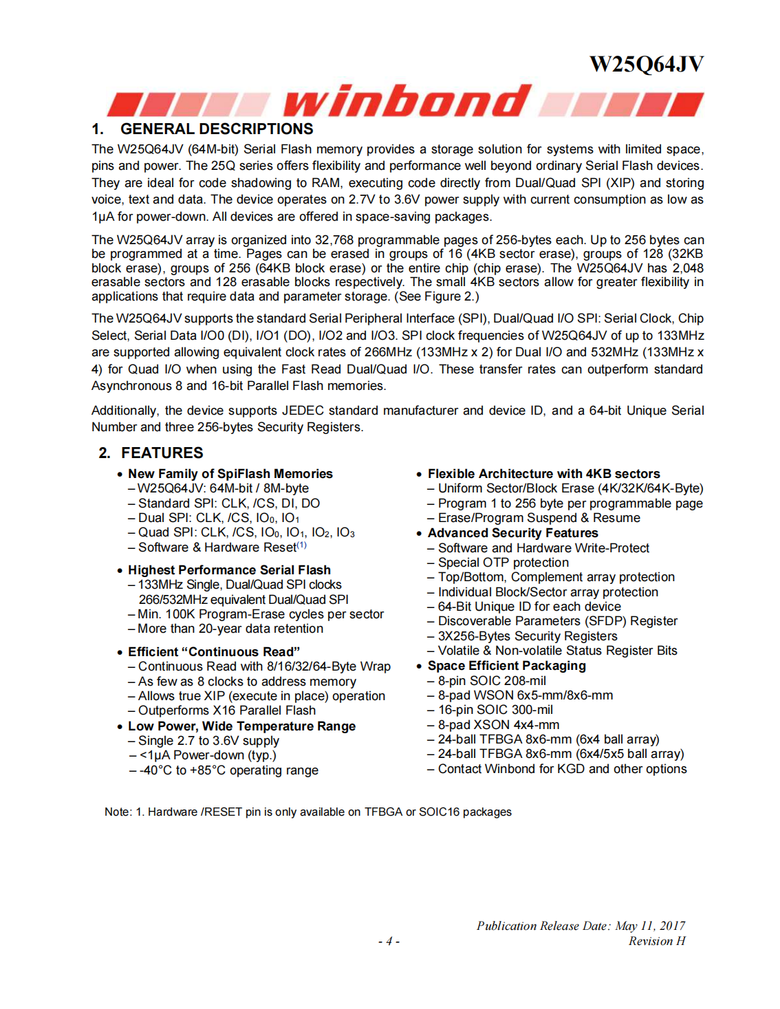 The W25Q64JV (64M-bit) Serial Flash memory provides a storage solution for systems with limited space, pins and power. The 25Q series offers flexibility and performance well beyond ordinary Serial Flash devices