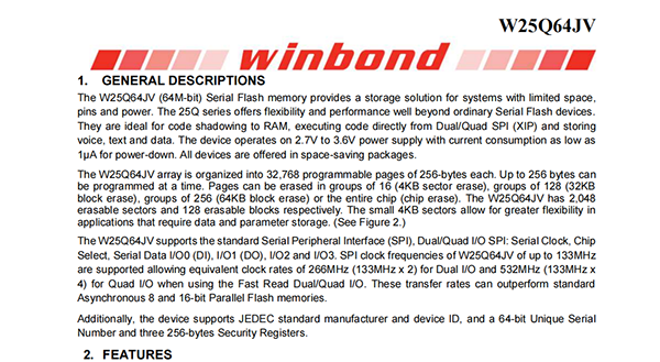 The W25Q64JV(64M-bit)Serial Flash memory provides a storage solution for systems with limited space,pins and power.The 25Q series offers flexibility and performance well beyond ordinary Serial Flash devices.They are ideal for code shadowing to RAM,executing code directly from Dual/Quad SPI(XIP)and storing voice,text and data.The device operates on 2.7V to 3.6V power supply with current consumption as low as 1μA for power-down.All devices are offered in space-saving packages.