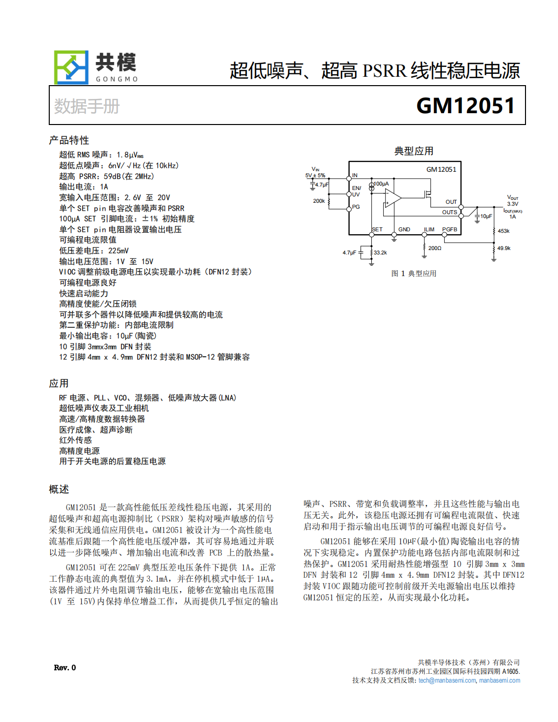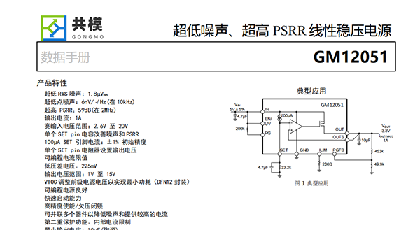 GM12051 是一款高性能低壓差線性穩(wěn)壓電源,其采用的 超低噪聲和超高電源抑制比(PSRR)架構(gòu)對(duì)噪聲敏感的信號(hào) 采集和無線通信應(yīng)用供電