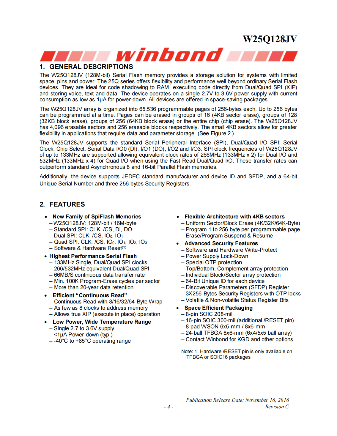 The W25Q128JV (128M-bit) Serial Flash memory provides a storage solution for systems with limited space, pins and power