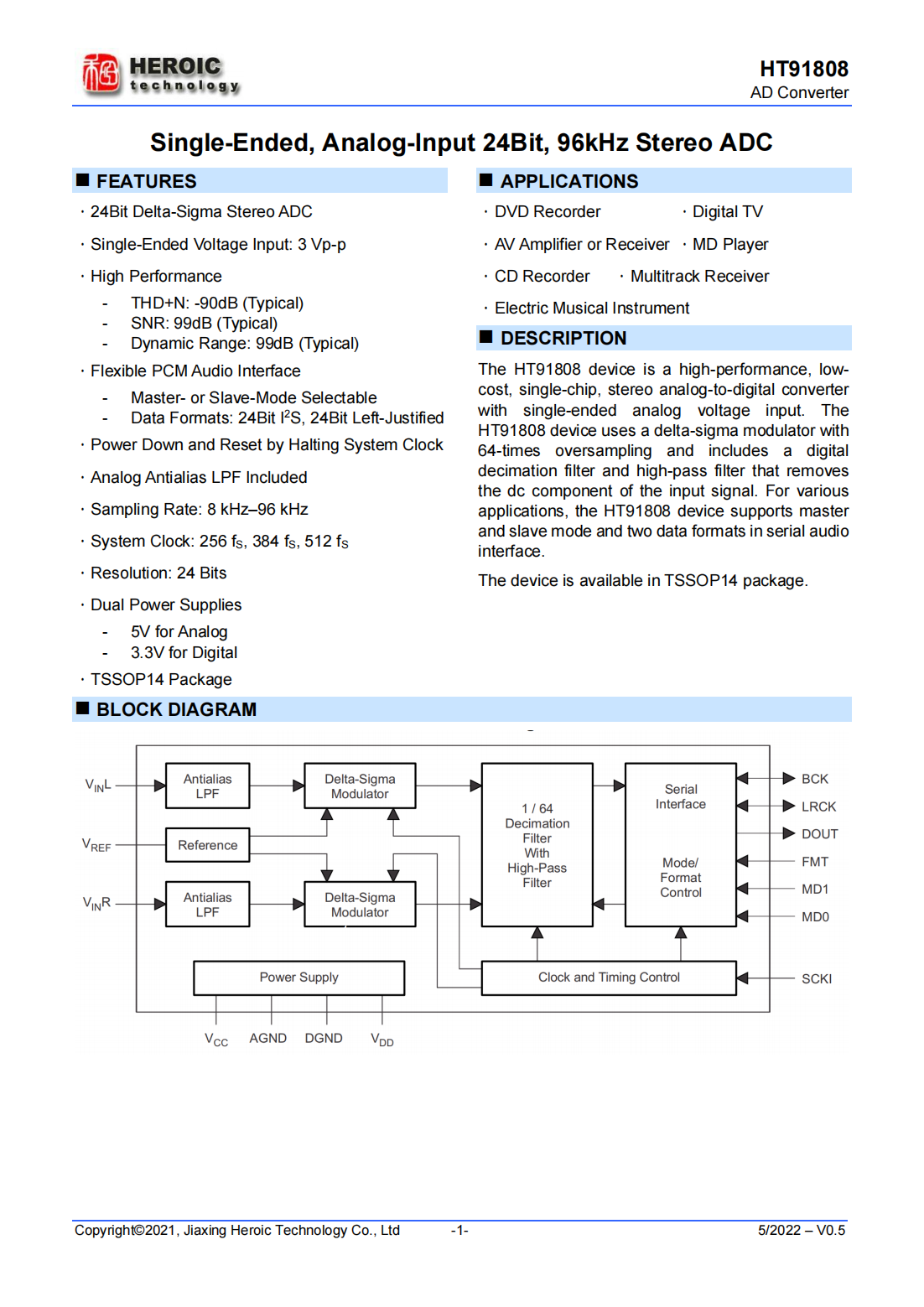 The HT91808 device is a high-performance, lowcost, single-chip, stereo analog-to-digital converter with single-ended analog voltage input