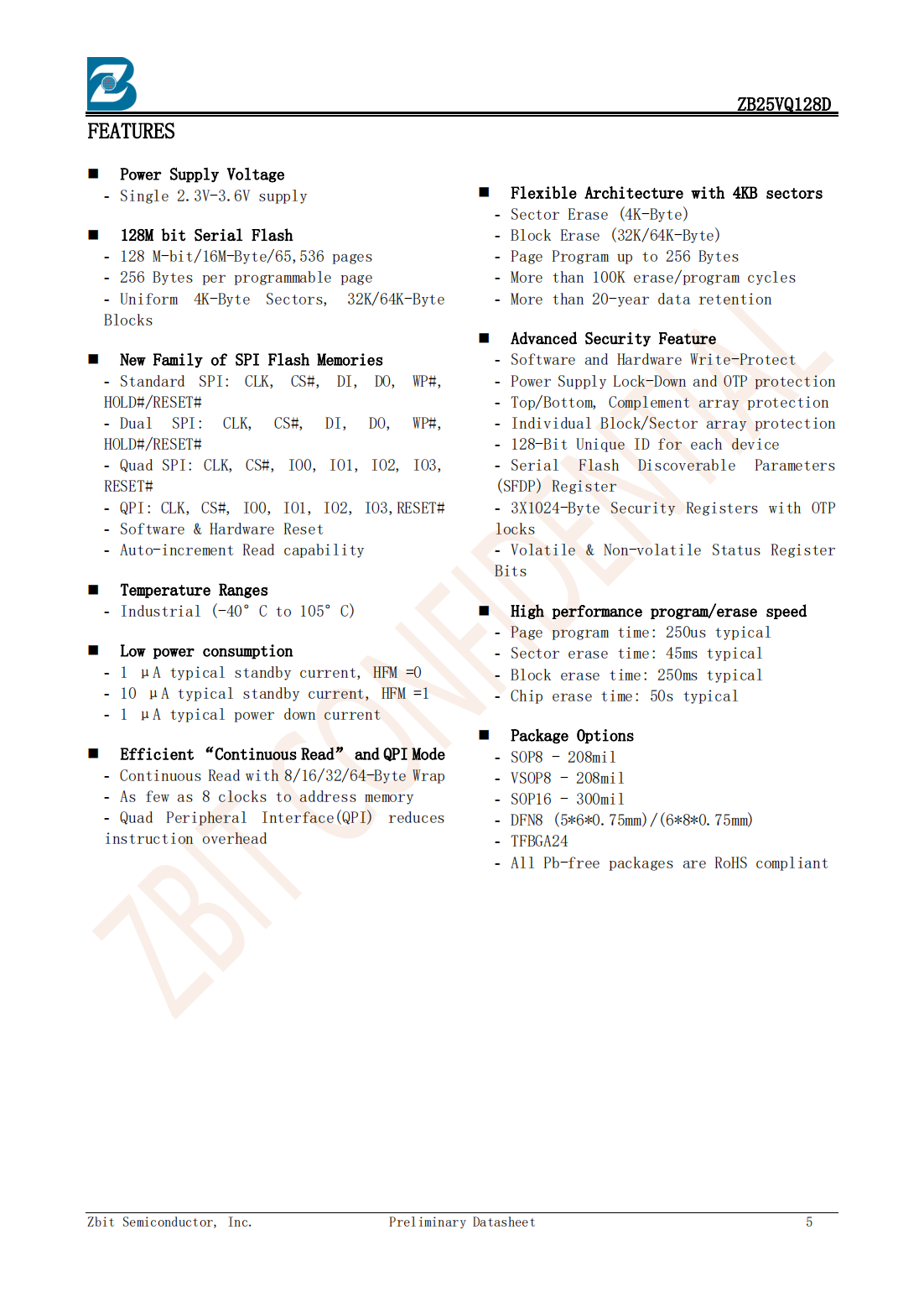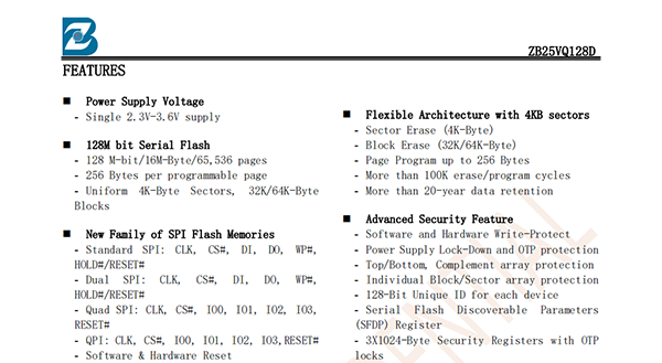 The ZB25VQ128D of non-volatile flash memory device supports the standard Serial Peripheral Interface (SPI).