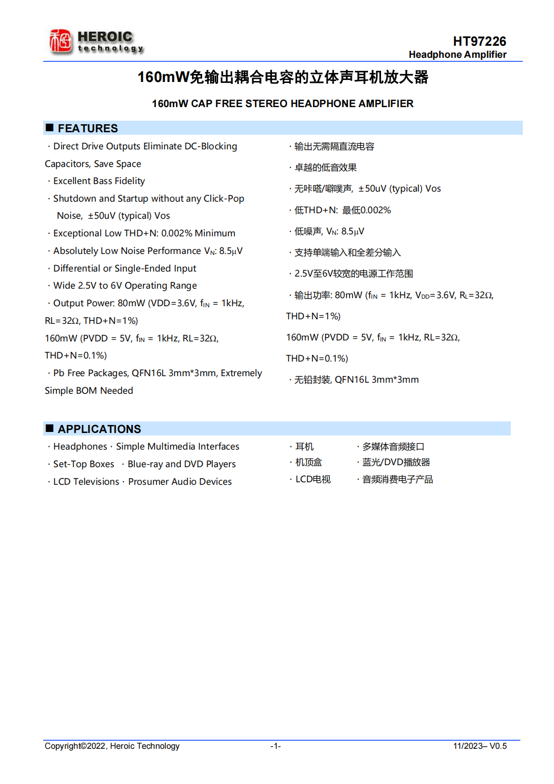 HT97226是一款差分輸入/單端輸入、可直接輸出驅(qū)動的耳機(jī)放大器。5V供電時(shí),器件可為32ohm耳機(jī)提供180mW的功率。器件可通過外部電阻調(diào)節(jié)增益。器件在音頻范圍內(nèi)具有卓越的THD+N表現(xiàn)。