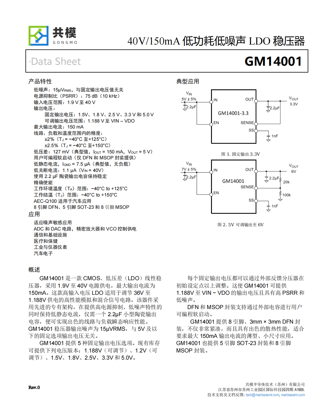 GM14001穩(wěn)壓器輸出噪聲為15μVRMS,與5V及以下的固定選項(xiàng)輸出電壓無關(guān)。