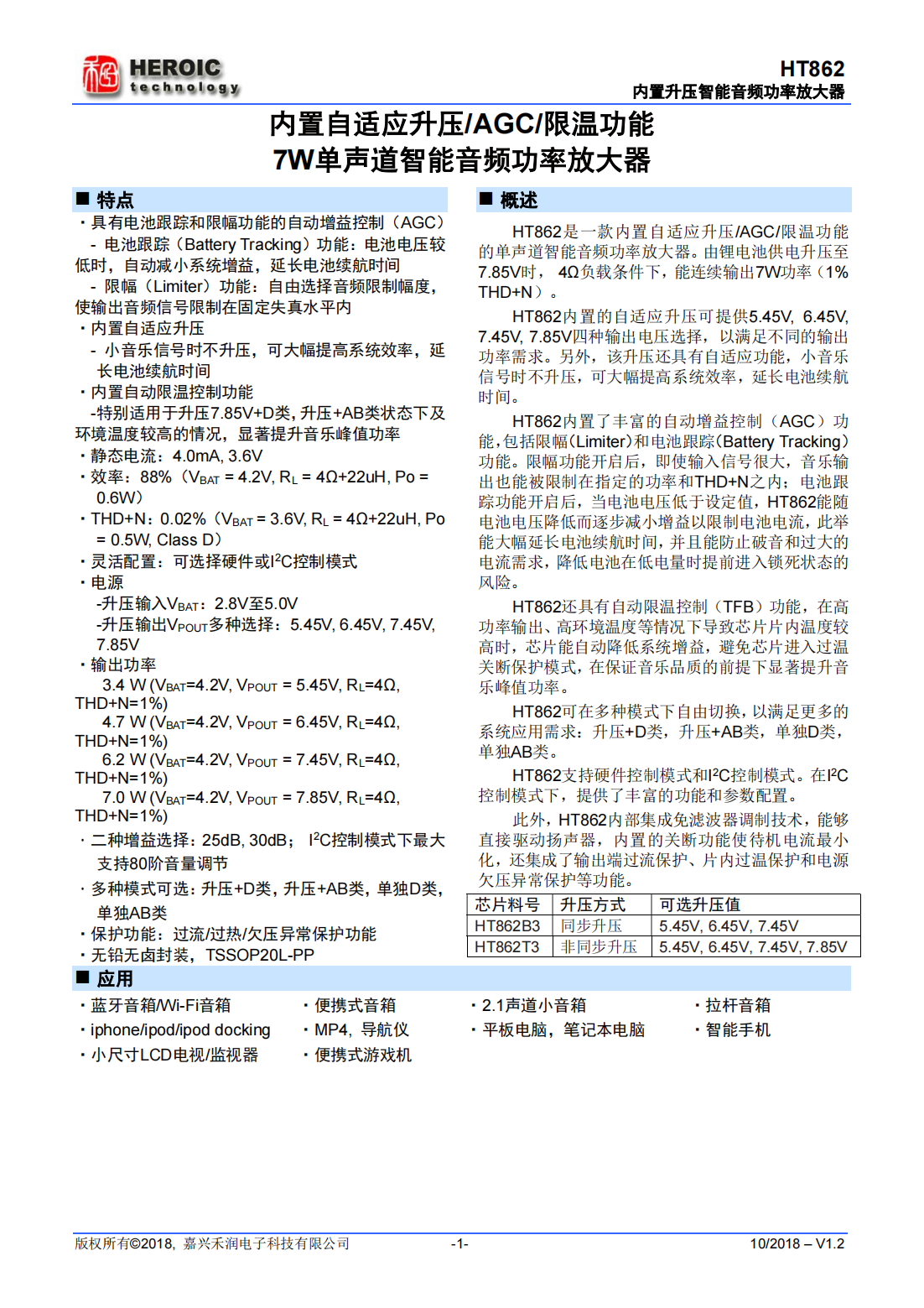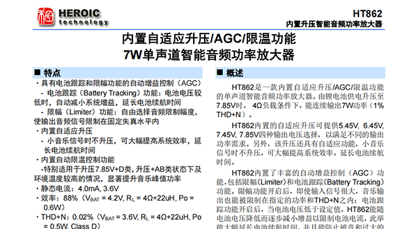 HT862是一款內(nèi)置自適應(yīng)升壓/AGC/限溫功能的單聲道智能音頻功率放大器。由鋰電池供電升壓至7.85V時(shí),4Ω負(fù)載條件下,能連續(xù)輸出7W功率(1%THD+N)。