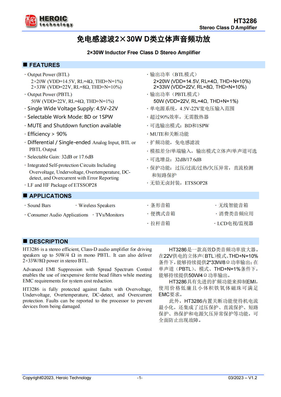HT3286是一款高效D類音頻功率放大器。 在22V供電的立體聲(BTL)模式、THD+N=10% 條件下,能夠持續(xù)提供2*33W/8Ω功率輸出;在 單聲道(PBTL)、模式、THD+N=1%條件下, 能夠持續(xù)提供50W/4Ω功率輸出