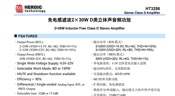 HT3286是一款高效D類音頻功率放大器。在22V供電的立體聲(BTL)模式、THD+N=10%條件下,能夠持續(xù)提供2*33W/8Ω功率輸出;在單聲道(PBTL)、模式、THD+N=1%條件下,能夠持續(xù)提供50W/4Ω功率輸出。HT3286具有先進的擴頻功能來抑制EMI,使用價格低廉且小體積鐵氧體磁珠可滿足EMC要求。此外,HT3286內置關斷功能使待機電流最小化,還集成了過壓保護、直流保護、短路保護、熱保護和電源欠壓異常保護等功能,可全面防止出現(xiàn)故障。