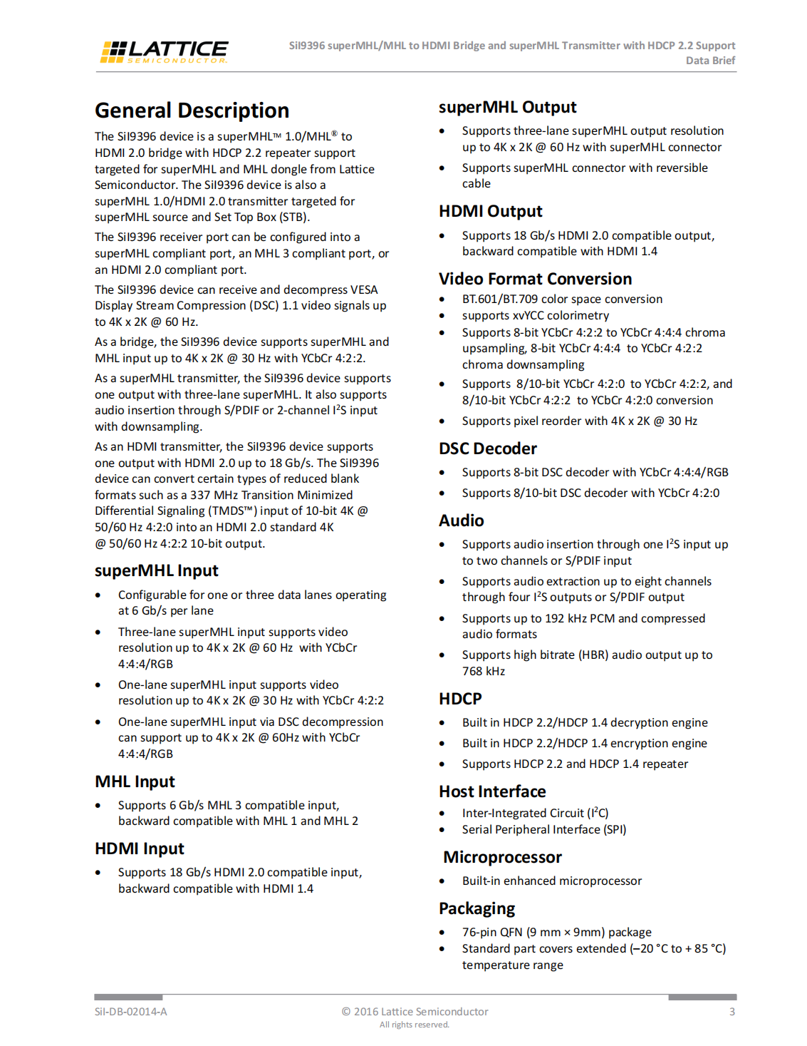 The SiI9396 device is a superMHLTM 1.0/MHL®to HDMI 2.0 bridge with HDCP 2.2 repeater support targeted for superMHL and MHL dongle from Lattice Semiconductor.The SiI9396 device is also a superMHL 1.0/HDMI 2.0 transmitter targeted for superMHL source and Set Top Box(STB).