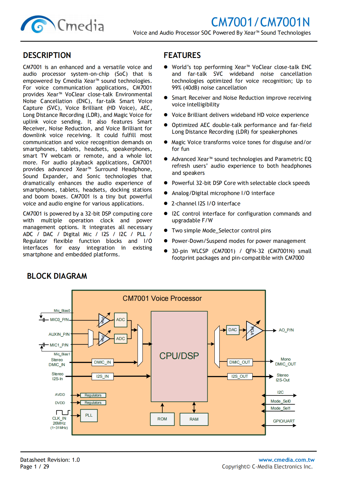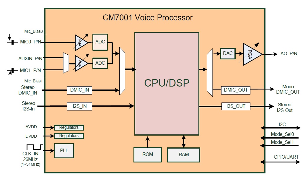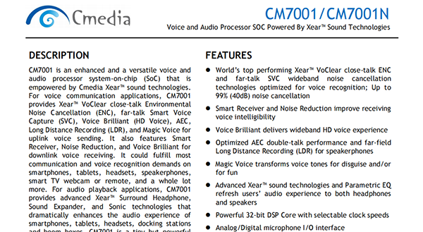 CM7001 is an enhanced and versatile voice and audio processor SoC, which is empowered by Cmedia Xear? sound technologies. For voice communication applications, CM7001 provides Xear? VoClear close-talk environmental noise cancellation (ENC), far-talk smart voice capture (SVC), Voice Brilliant (HD Voice), AEC, Long Distance Recording (LDR), and Magic Voice for uplink voice sending; it also features Smart Receiver, Noise Reduction, and Voice Brilliant for downlink voice receiving. It could fulfill most communication and voice recognition demands on mobile phones, tablets, headsets, speakerphones, Smart TV’s webcam or the remotes, etc. For audio playback applications, CM7001 provides advanced Xear? Surround Headphone, Sound Expander, and Sonic technologies, which could dramatically enhance the audio experience of mobile phones, tablets, headsets, docking stations and boom boxes. CM7001 is a tiny but powerful voice and audio engine for various applications.BLOCK DIAGRAM