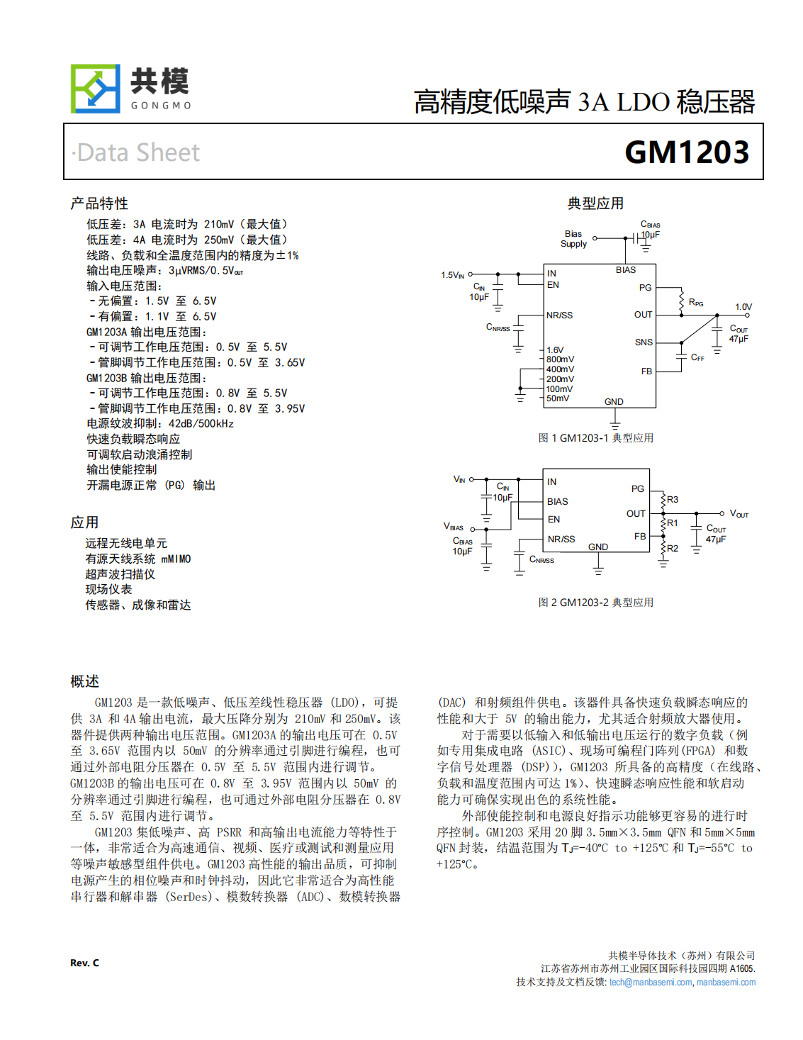GM1203集低噪聲、高PSRR和高輸出電流能力等特性于一體,非常適合為高速通信、視頻、醫(yī)療或測試和測量應用等噪聲敏感型組件供電。GM1203高性能的輸出品質(zhì),可抑制電源產(chǎn)生的相位噪聲和時鐘抖動,因此它非常適合為高性能串行器和解串器(SerDes)、模數(shù)轉(zhuǎn)換器(ADC)、數(shù)模轉(zhuǎn)換器(DAC)和射頻組件供電。該器件具備快速負載瞬態(tài)響應的性能和大于5V的輸出能力,尤其適合射頻放大器使用。對于需要以低輸入和低輸出電壓運行的數(shù)字負載(例如專用集成電路(ASIC)、現(xiàn)場可編程門陣列(FPGA)和數(shù)字信號處理器(DSP)),GM1203所具備的高精度(在線路、負載和溫度范圍內(nèi)可達1%)、快速瞬態(tài)響應性能和軟啟動能力可確保實現(xiàn)出色的系統(tǒng)性能。外部使能控制和電源良好指示功能夠更容易的進行時序控制。GM1203采用20腳3.5mm×3.5mm QFN和5mm×5mm QFN封裝,結(jié)溫范圍為TJ=-40°C to+125°C和TJ=-55°C to+125°C。