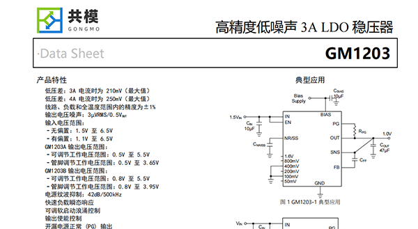GM1203是一款低噪聲、低壓差線性穩(wěn)壓器(LDO),可提供3A和4A輸出電流,最大壓降分別為210mV和250mV。該器件提供兩種輸出電壓范圍。GM1203A的輸出電壓可在0.5V至3.65V范圍內(nèi)以50mV的分辨率通過引腳進行編程,也可通過外部電阻分壓器在0.5V至5.5V范圍內(nèi)進行調(diào)節(jié)。