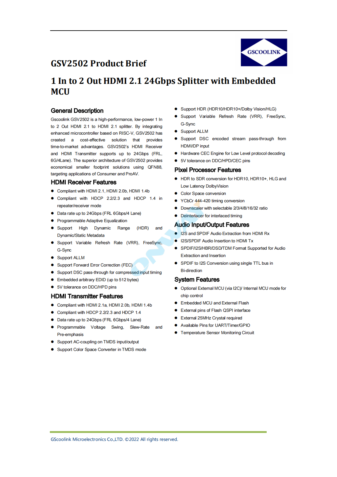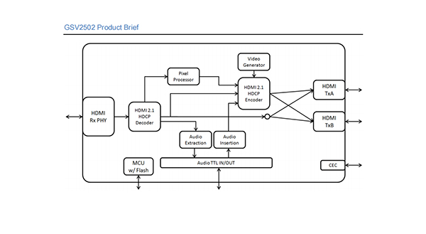 Gscoolink GSV2502 is a high-performance,low-power 1 In to 2 Out HDMI 2.1 to HDMI 2.1 splitter.By integrating enhanced microcontroller based on RISC-V,GSV2502 has created a cost-effective solution that provides time-to-market advantages.GSV2502’s HDMI Receiver and HDMI Transmitter supports up to 24Gbps(FRL,6G/4Lane).The superior architecture of GSV2502 provides economical smaller footprint solutions using QFN88,targeting applications of Consumer and ProAV.