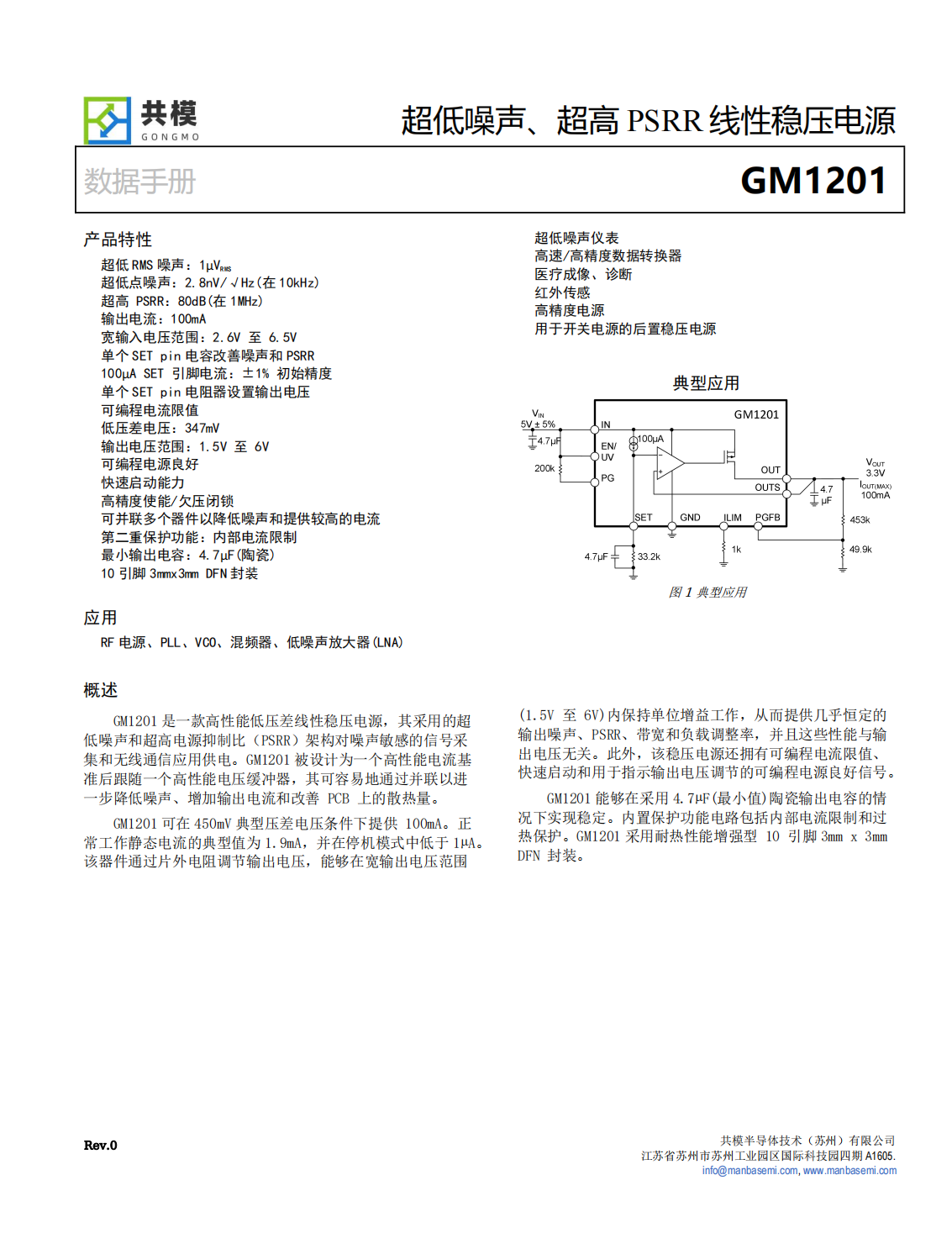 GM1201是一款高性能低壓差線性穩(wěn)壓電源,其采用的超低噪聲和超高電源抑制比(PSRR)架構(gòu)對(duì)噪聲敏感的信號(hào)采集和無線通信應(yīng)用供電。GM1201被設(shè)計(jì)為一個(gè)高性能電流基準(zhǔn)后跟隨一個(gè)高性能電壓緩沖器,其可容易地通過并聯(lián)以進(jìn)一步降低噪聲、增加輸出電流和改善PCB上的散熱量。