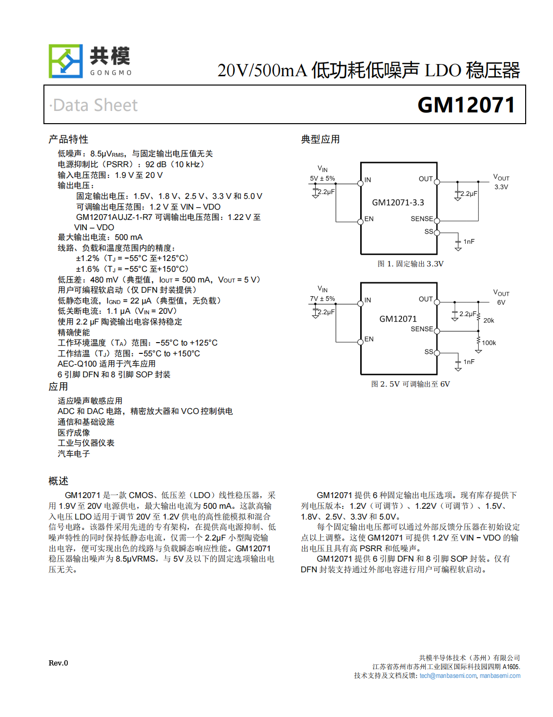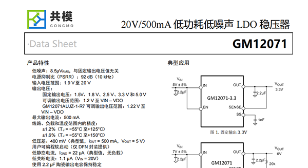GM12071提供6種固定輸出電壓選項(xiàng)?,F(xiàn)有庫存提供下列電壓版本:1.2V(可調(diào)節(jié))、1.22V(可調(diào)節(jié))、1.5V、1.8V、2.5V、3.3V和5.0V。每個(gè)固定輸出電壓都可以通過外部反饋分壓器在初始設(shè)定點(diǎn)以上調(diào)整。這使GM12071可提供1.2V至VIN?VDO的輸出電壓且具有高PSRR和低噪聲。