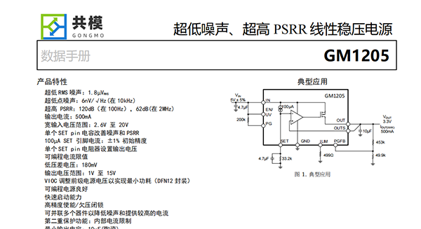 GM1205是一款高性能低壓差線性穩(wěn)壓電源,其采用的超低噪聲和超高電源抑制比(PSRR)架構(gòu)對噪聲敏感的信號采集和無線通信應(yīng)用供電。GM1205被設(shè)計為一個高性能電流基準(zhǔn)后跟隨一個高性能電壓緩沖器,其可容易地通過并聯(lián)以進(jìn)一步降低噪聲、增加輸出電流和改善PCB上的散熱量。