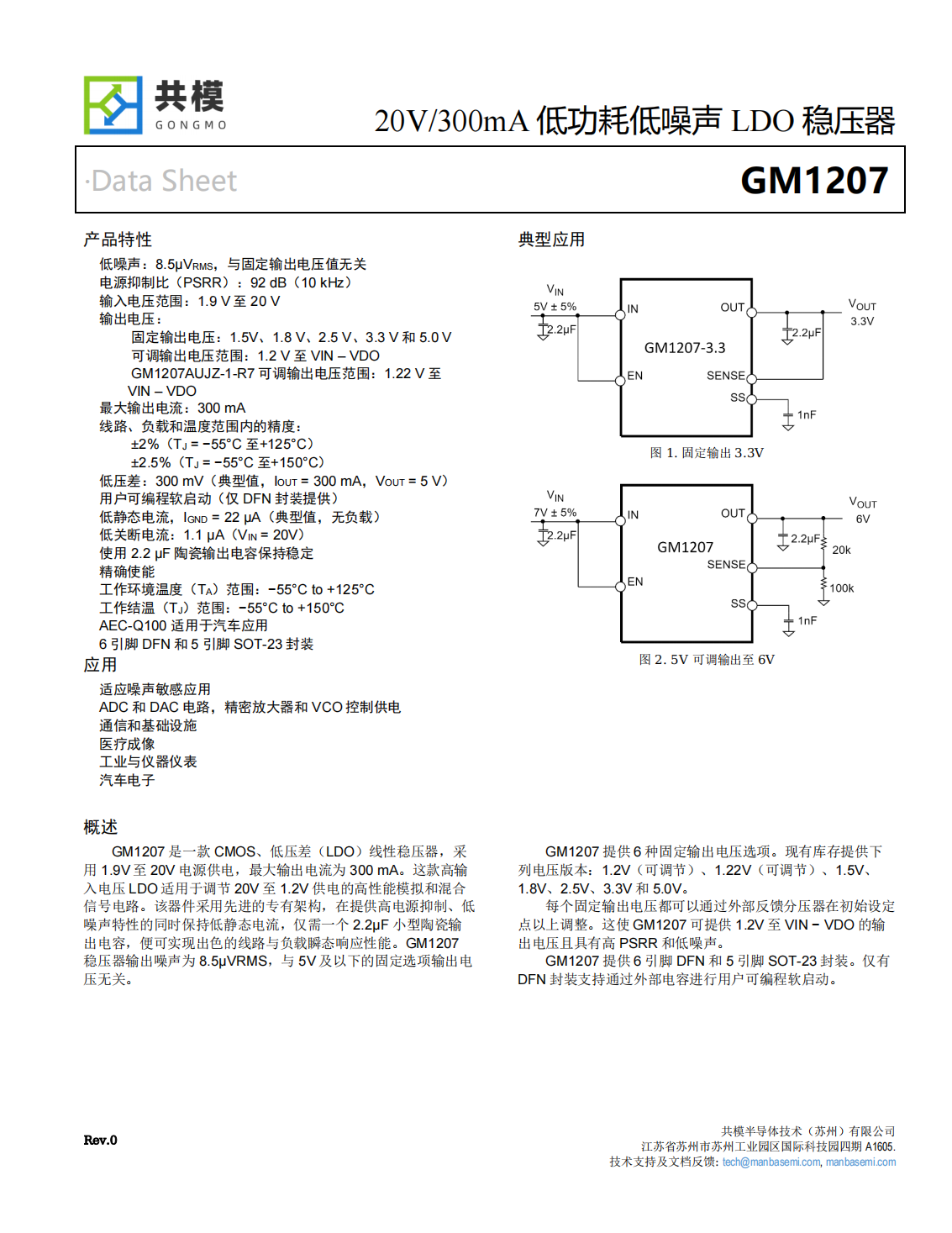 GM1207提供6種固定輸出電壓選項?,F(xiàn)有庫存提供下列電壓版本:1.2V(可調(diào)節(jié))、1.22V(可調(diào)節(jié))、1.5V、1.8V、2.5V、3.3V和5.0V。每個固定輸出電壓都可以通過外部反饋分壓器在初始設(shè)定點以上調(diào)整。這使GM1207可提供1.2V至VIN?VDO的輸出電壓且具有高PSRR和低噪聲。