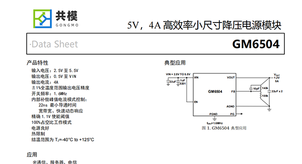 GM6504是一個(gè)非常小、高效同步4A降壓直流/直流電源模塊,從2.5V到5.5V的輸入電源運(yùn)行。該電源模塊使用固定開(kāi)關(guān)頻率1.6MHz進(jìn)行內(nèi)部補(bǔ)償?shù)姆逯惦娏髂J娇刂?,最小開(kāi)關(guān)時(shí)間低至22ns,通過(guò)較小的外部組件實(shí)現(xiàn)快速瞬態(tài)響應(yīng)。