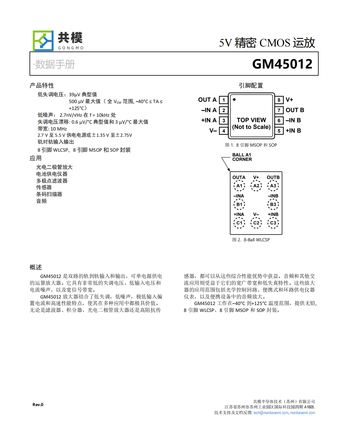 GM45012工作在?40°C到+125°C溫度范圍,提供無(wú)鉛,8引腳WLCSP、8引腳MSOP和SOP封裝。