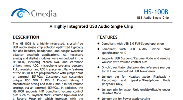 HS100B是一顆高度集成的單芯片USB音頻解決方案,外部省略晶振,適用于USB耳機和加密狗(無線適配器可用)的應(yīng)用