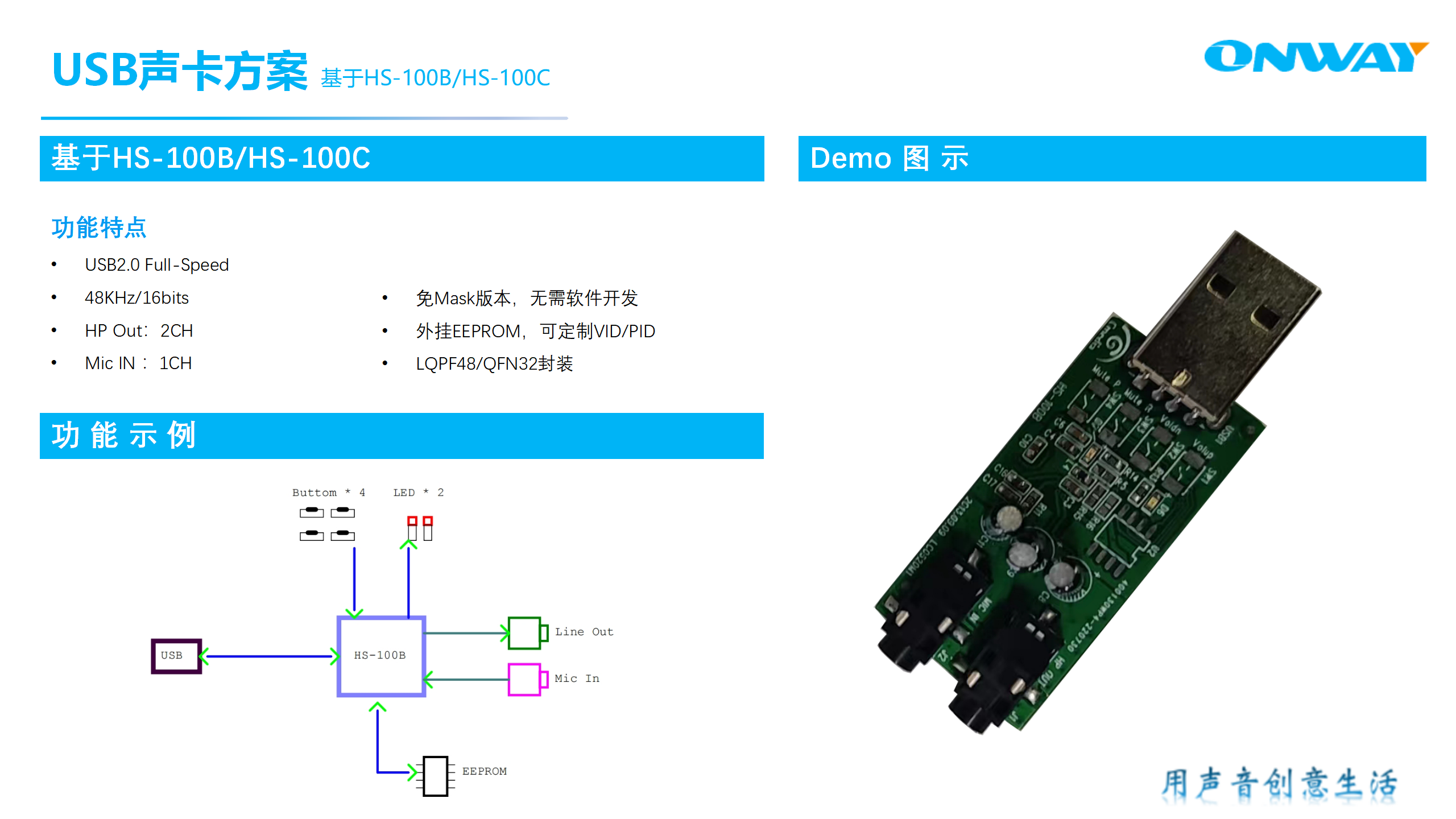 HS-100B/C是一種高度集成、無需晶振的USB音頻單芯片解決方案,通常針對(duì)USB耳機(jī)、頭戴式耳機(jī)、USB聲卡等應(yīng)用